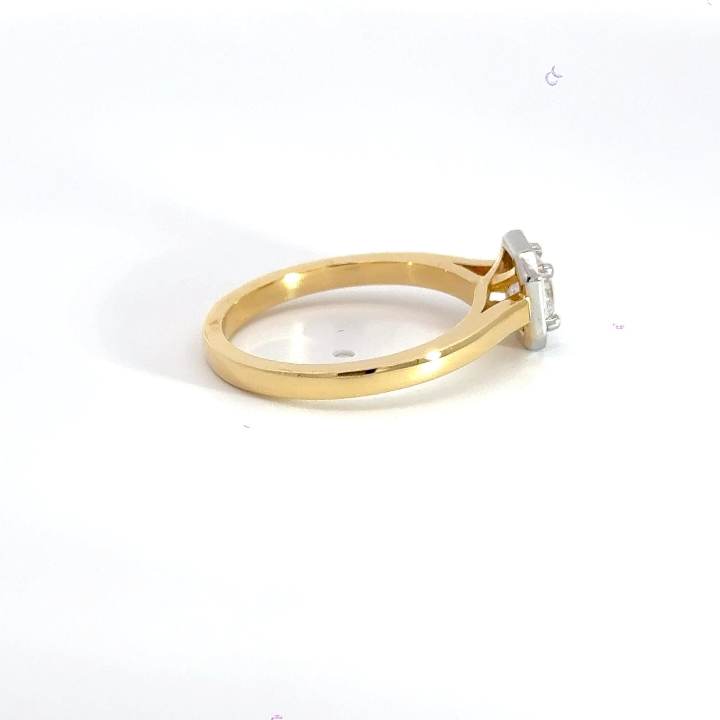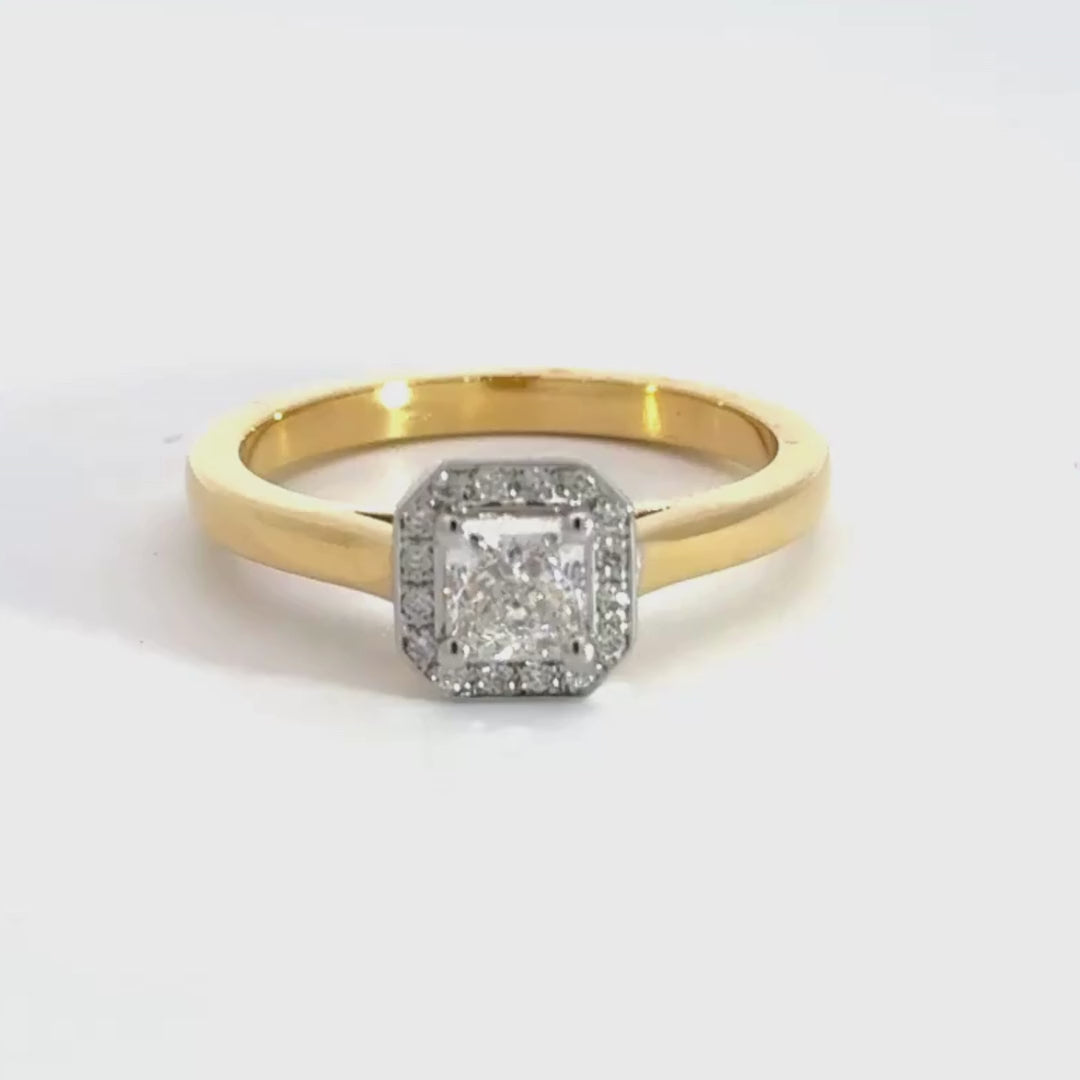 Discover the elegance of our 18ct Gold Square Diamond Ring, featuring a stunning princess-centre diamond of 0.60 carats, encircled by a dazzling halo of brilliant round-cut diamonds. With a total diamond weight of 0.70ct this exquisite piece boasts E colour and SI clarity, ensuring a captivating sparkle from every angle. Perfect for marking special occasions or adding a touch of luxury to your collection, this ring is a timeless representation of sophistication and beauty. Size O