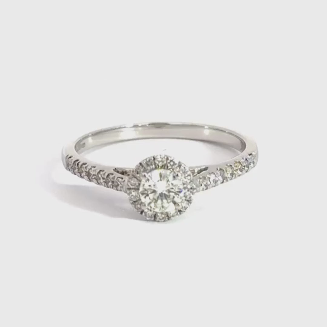 This 18CT White Gold Halo Diamond Ring & Diamond Shoulders is a breathtaking representation of love and commitment, crafted to be cherished forever.