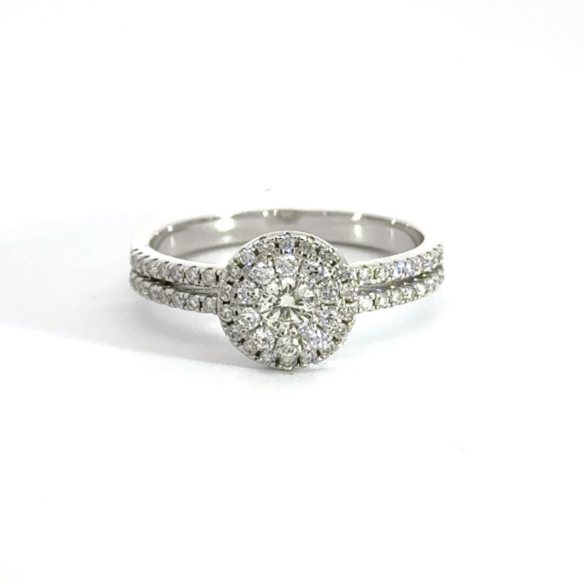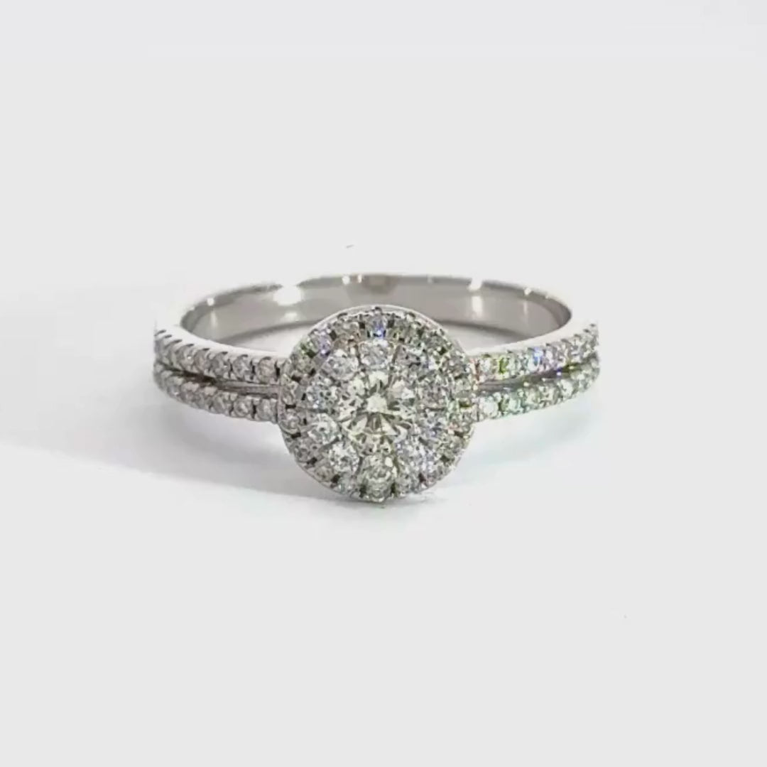 18CT White Gold Diamond Round Halo Split Shoulders Ring