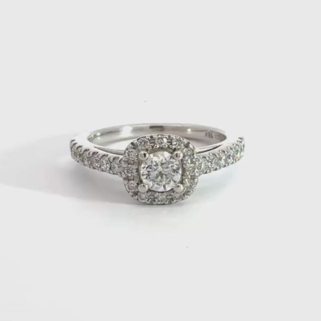 This stunning 18ct white gold engagement ring features a round cut centre stone, that is surrounded by a dazzling diamond halo. There is a total of 0.75ct of diamond in this ring that was carefully crafted by our jeweller in store. CODE: ACES889