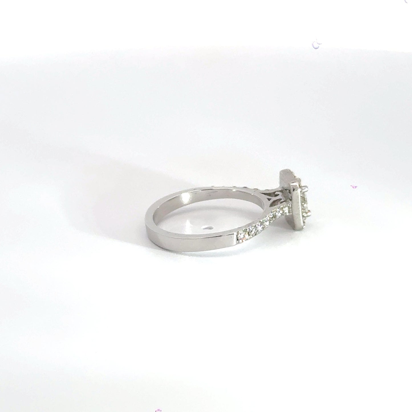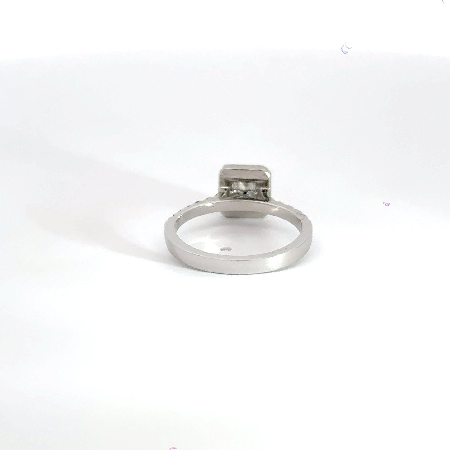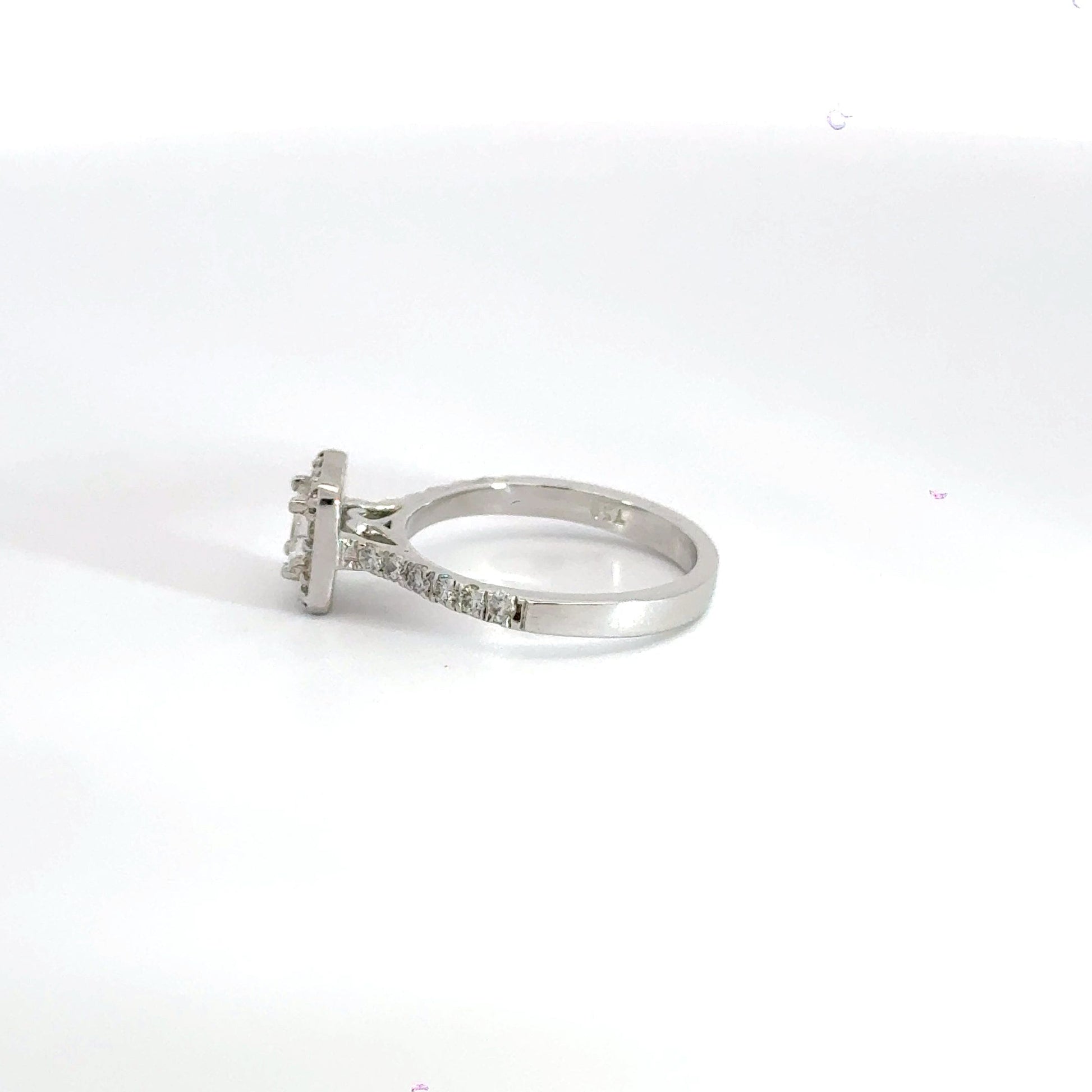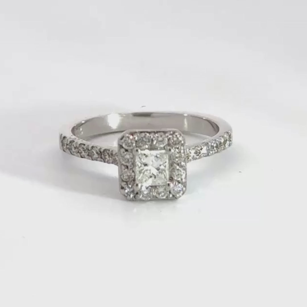 This beautiful hand crafted ring has a princess cut centre diamond accompanied by a halo of brilliant round cut diamonds, the band is 18ct white gold with diamond shoulders totalling 0.70ct diamond this ring has a sparkle to love, the diamonds are G colour SI1 Clarity. Ring size is H