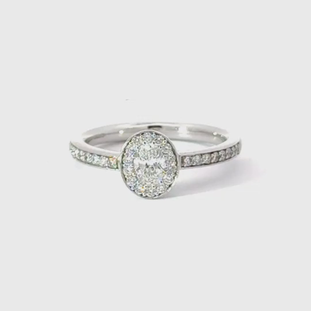 This stunning 18ct white gold diamond ring features a 0.25ct Oval brilliant centre diamond surrounded by brilliant round cut diamonds and diamond shoulders the overall diamond total is 0.50ct G Colour HSI1 Clarity size M1/2