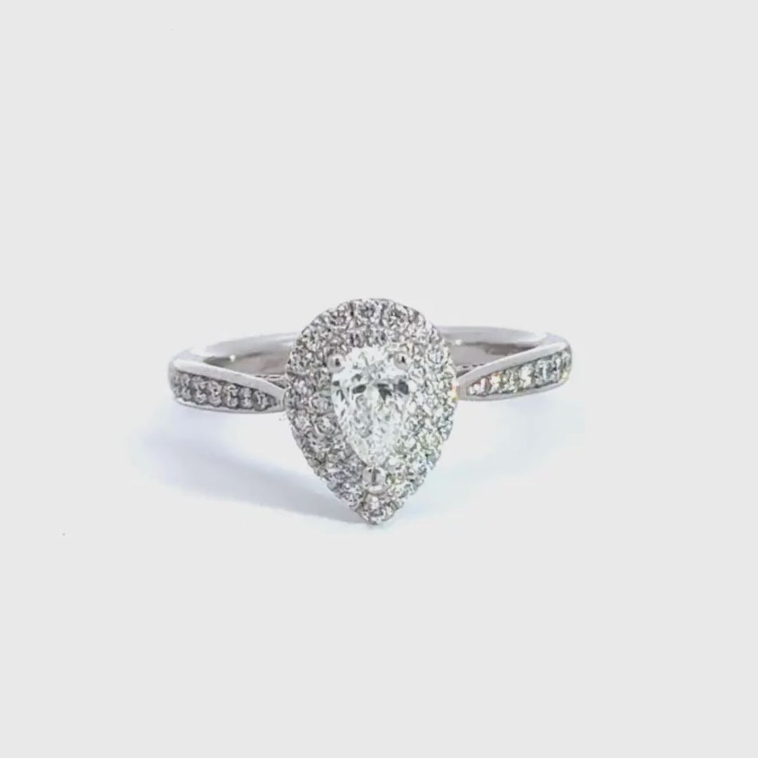 Elegantly designed 18ct White gold Teardrop Ring with its brilliant cut teardrop centre diamond surrounded by a halo of brilliant round cut diamonds featuring bright diamond shoulders totalling 1.00ct E colour VS2 Clarity Size M