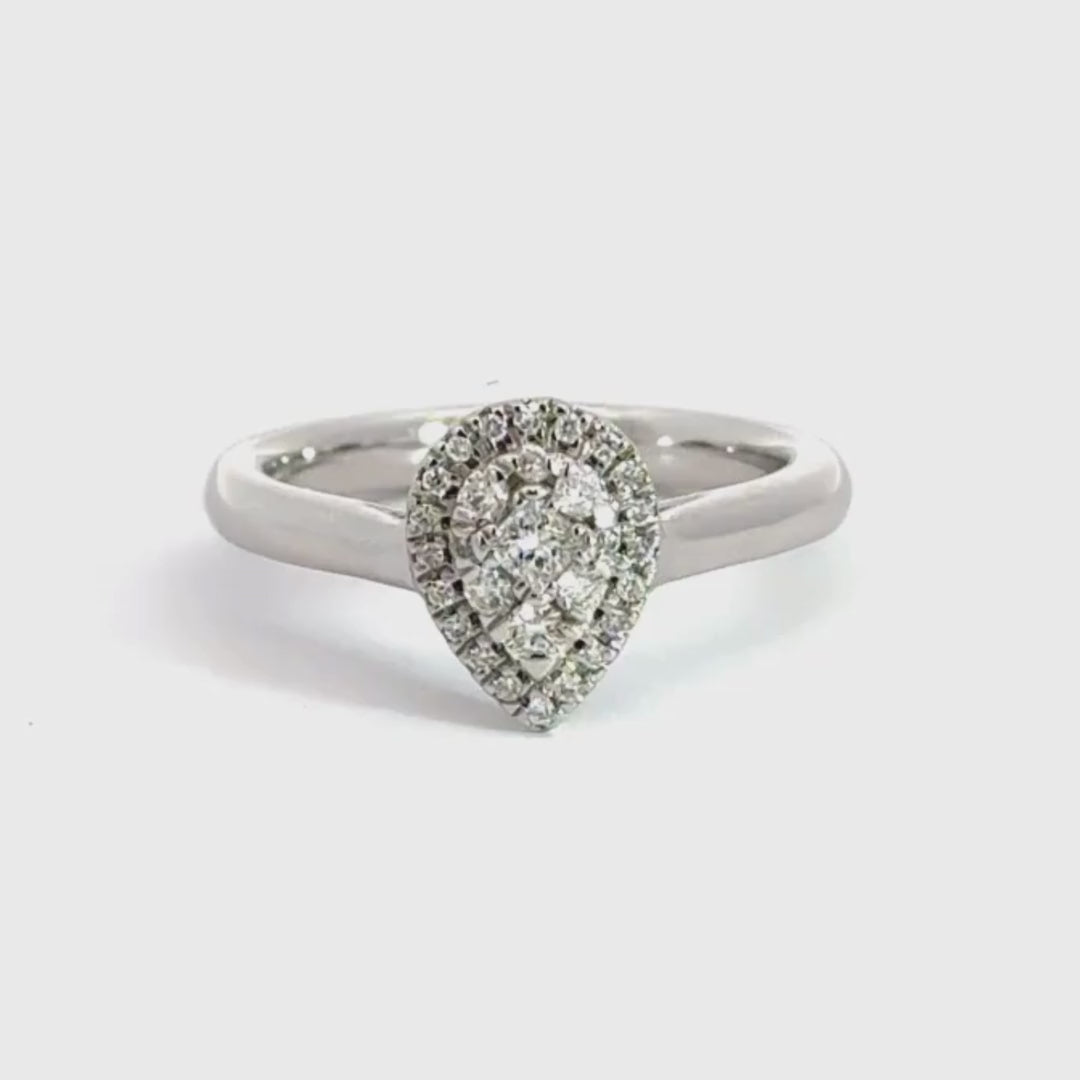 A Beautiful 18ct White Gold Teardrop ring featuring a cluster of brilliant round cut diamonds in the centre surrounded by a halo of smaller brilliant round cut diamonds with smooth sleek shoulders the diamond total is 0.25ct G/H Colour SI2 Clarity size M
