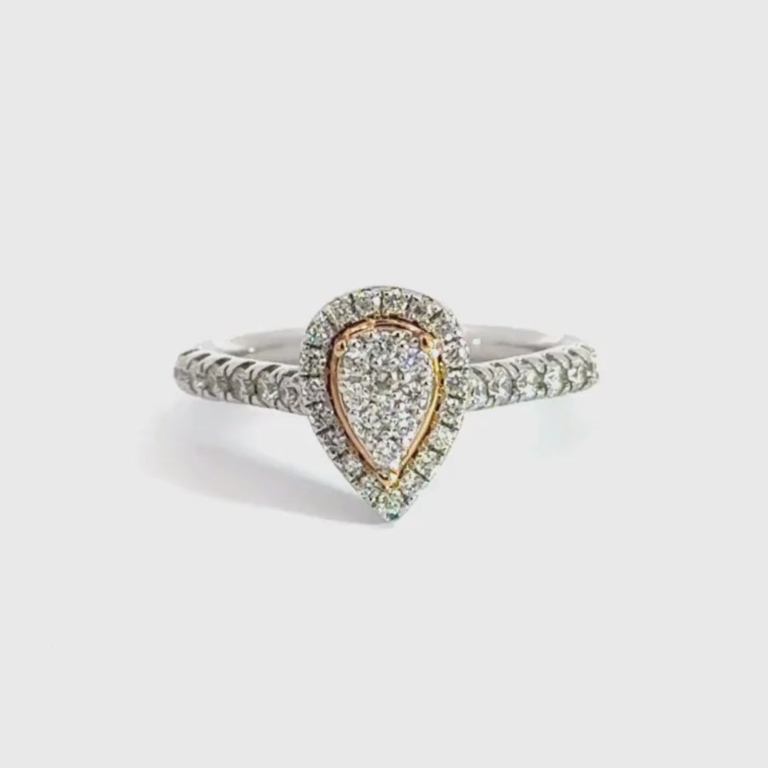 This beautiful handcrafted 18ct White gold pear shaped ring features a centre pear shaped illusion set cluster of brilliant round cut diamonds set on a rose gold rim surrounded by a halo of brilliant round cut diamonds and diamond shoulders totalling 0.75ct G Colour SI Clarity Size L1/2