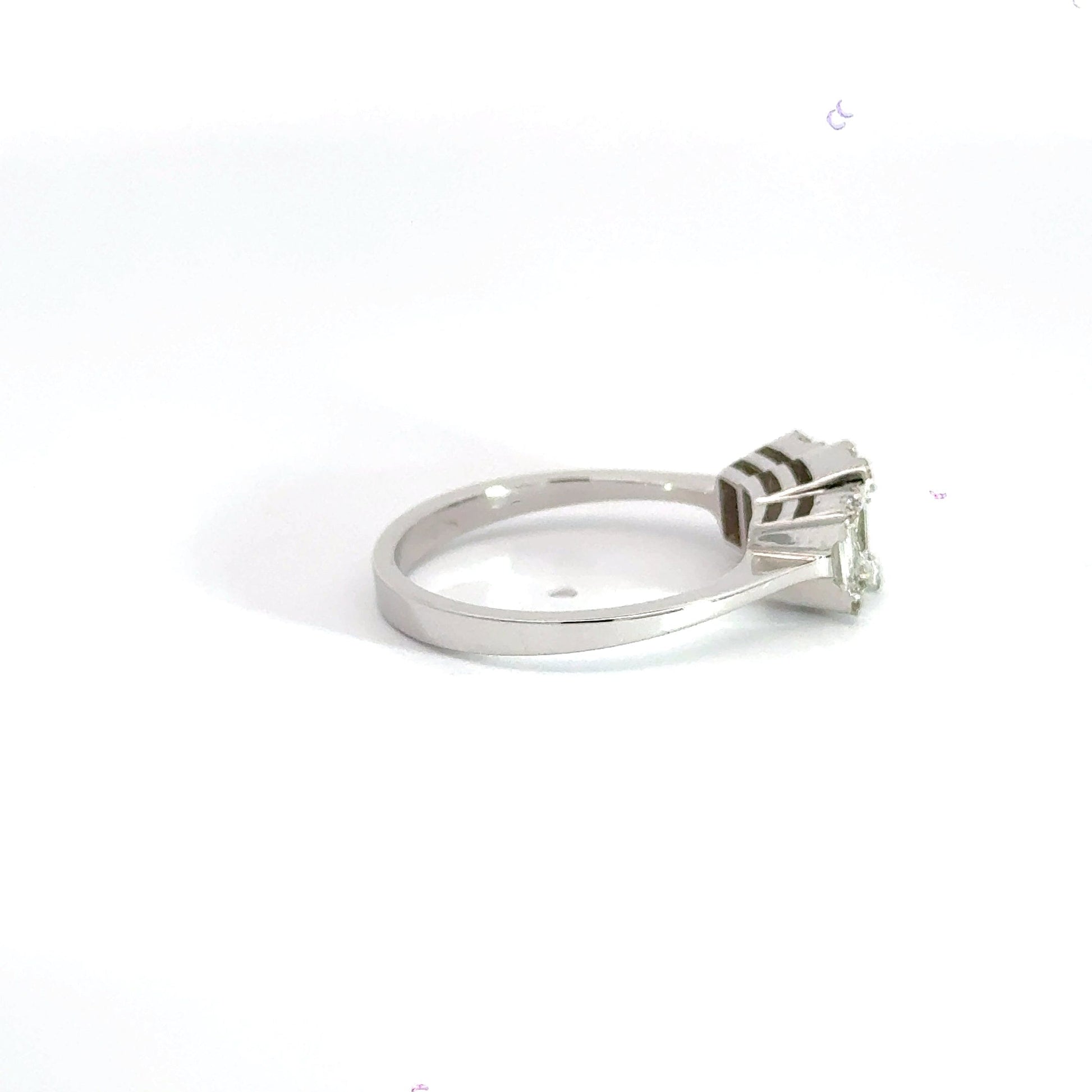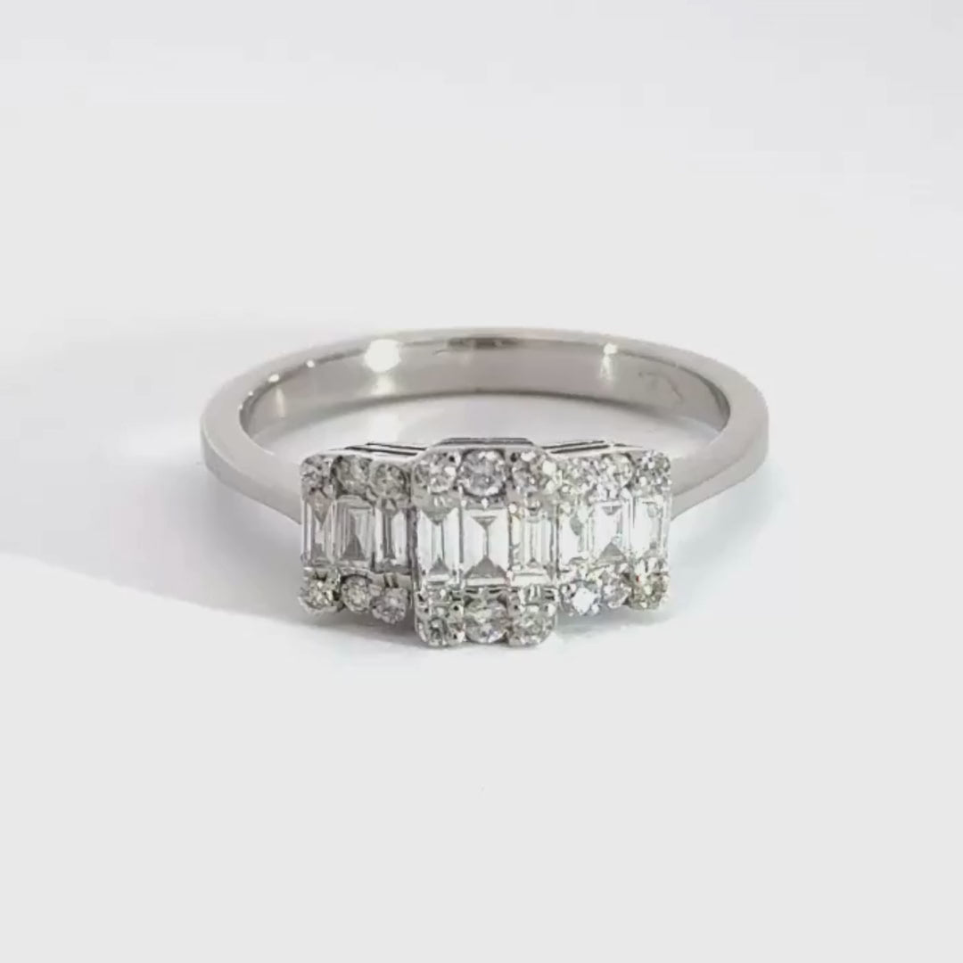 This stunning ring features a luxurious 18ct white gold band adorned with a trilogy of exquisite diamonds of 0.75ct G/ Si1 .The design showcases a captivating arrangement of baguette diamonds flanked by sparking round cut diamonds, creating a perfect harmony of shapes and brilliance. Ideal for commemorating a special occasion ,this elegant piece combines timeless sophistication with modern flair, making it a striking addition to any jewellery collection. Size N1/2
