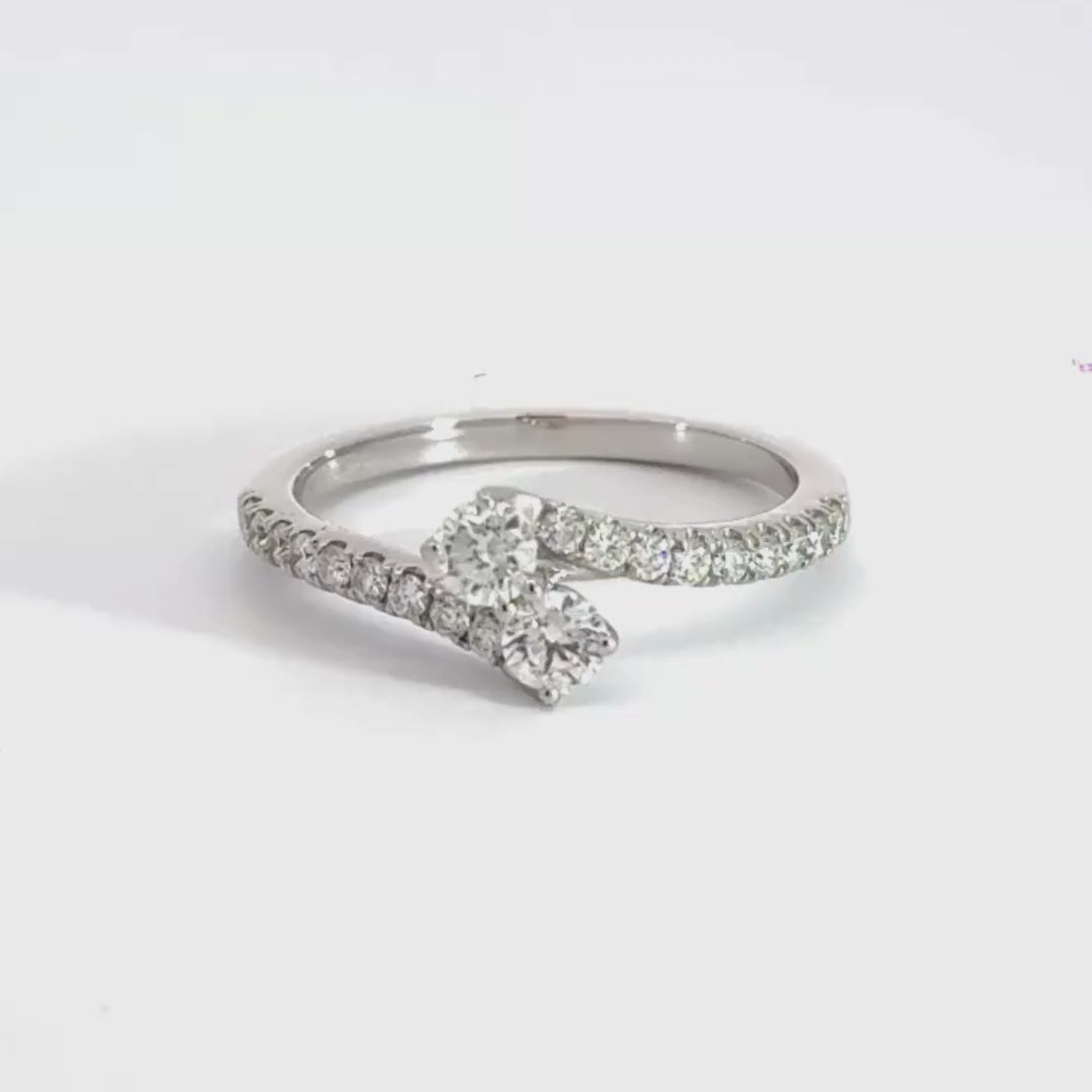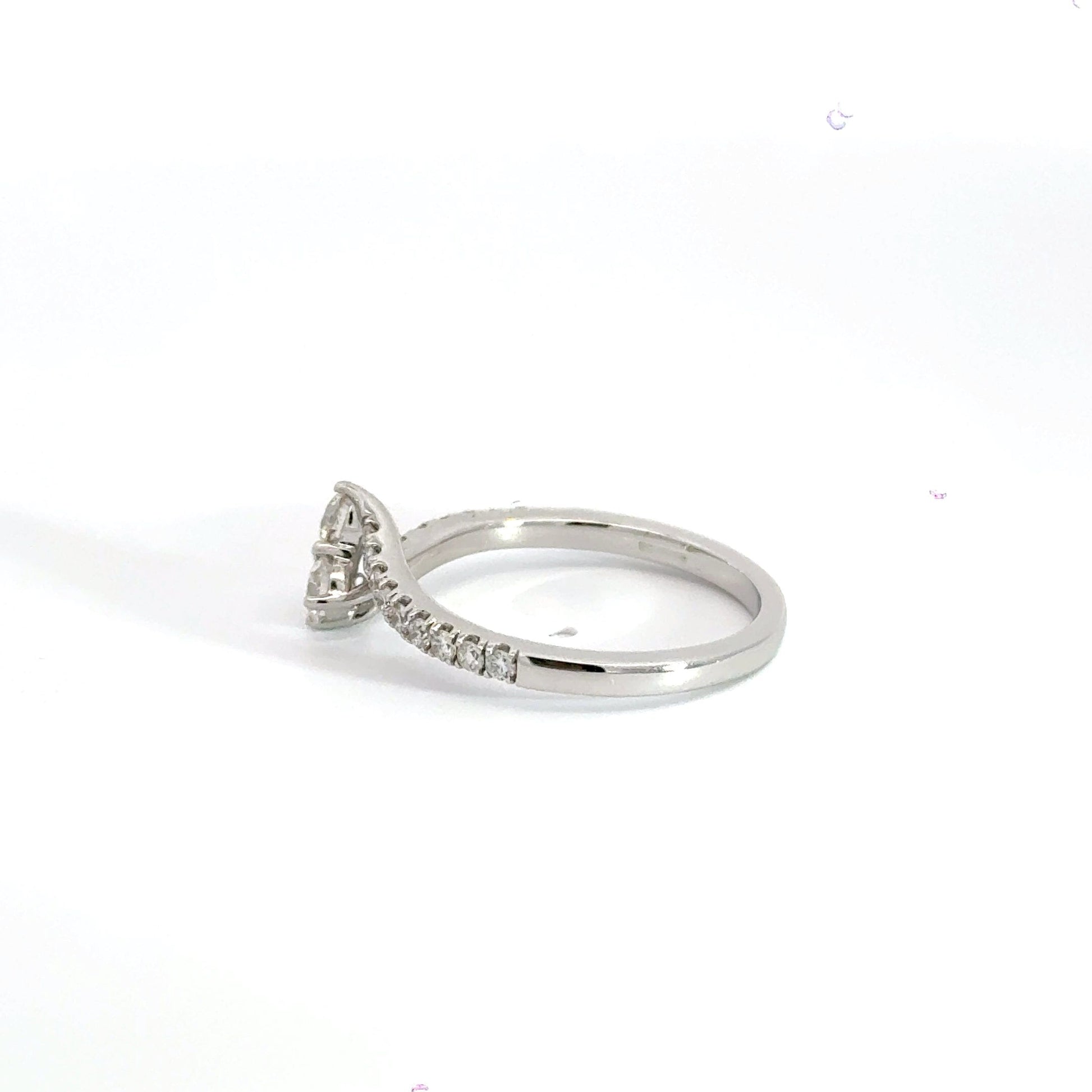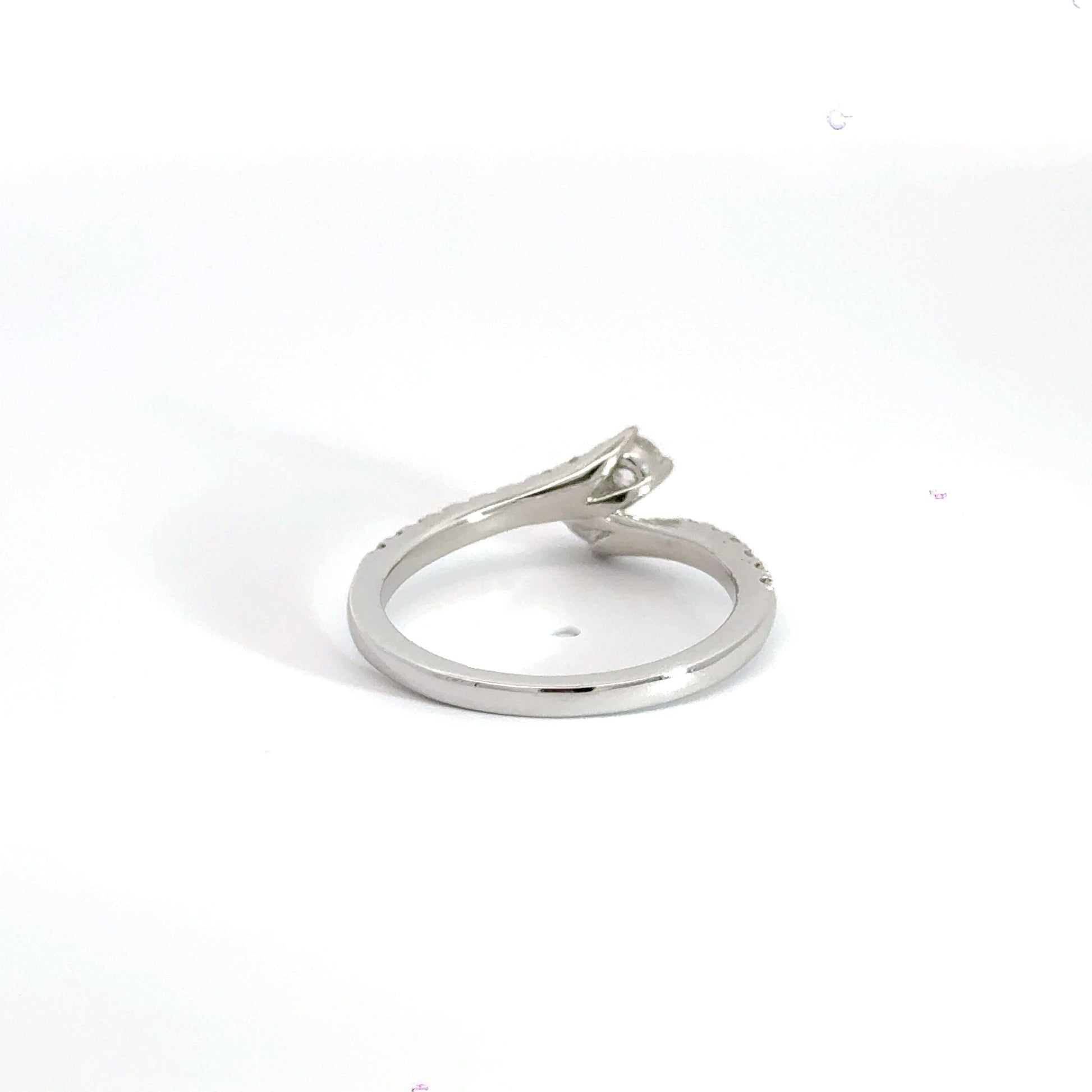 This exquisite 18ct white gold twist diamond ring features dazzling diamonds with a total weight of 0.50ct. The diamond showcases a G-H colour and SI2 clarity, ensuring a beautiful sparkle. The unique twist design is complemented by diamond-set shoulders, adding a touch of elegance and sophistication. This ring is a perfect symbol of love and commitment, ideal for engagements or special milestones, making it a timeless addition to any jewellery collection. Size M