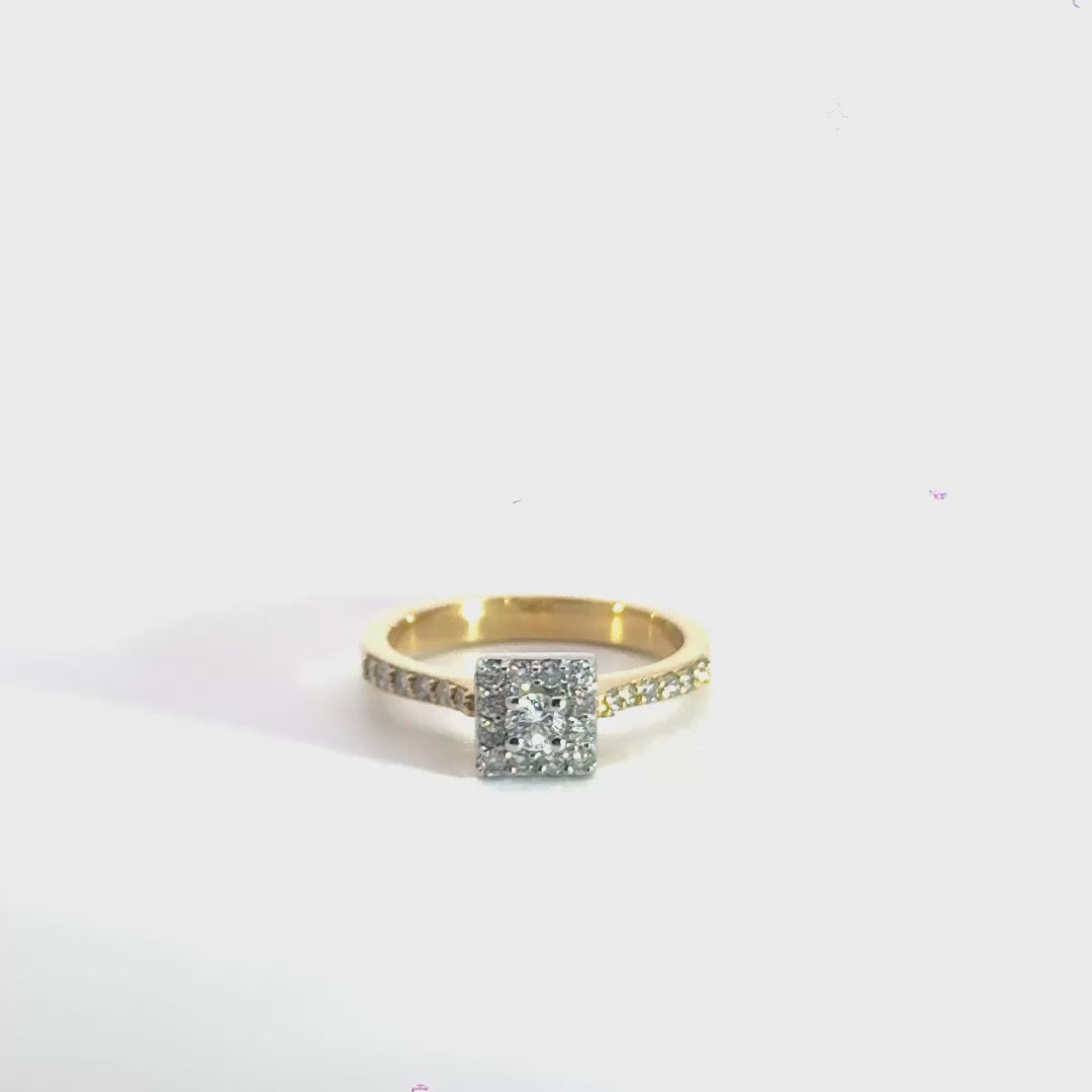 Elevate your elegance with this stunning 18ct gold square halo ring. At its centre lies a brilliant round cut diamond, beautifully framed by a halo of smaller brilliant round cut diamonds. The claw-set shoulders enhance the design, adding an extra touch of sophistication.