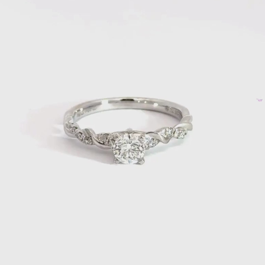 An attractive 18ct white gold brilliant round cut diamond solitaire ring with twist shoulders encrusted with small brilliant round cut diamonds totalling 0.50ct G Colour SI2 Clarity size L