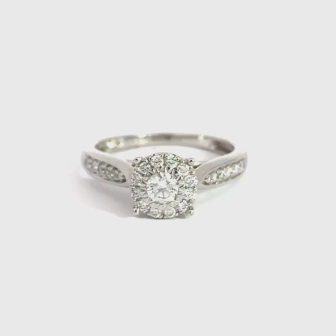 This beautiful 9ct White Gold diamond ring features a diamond cluster centre as well as elegant diamond embezzled shoulders. These diamonds have a total of 0.50ct and are G coloured with an SI clarity. This stunning ring was handcrafted by our jeweller in store. Available in size J in store but please enquire about resizing. CODE: SGB001