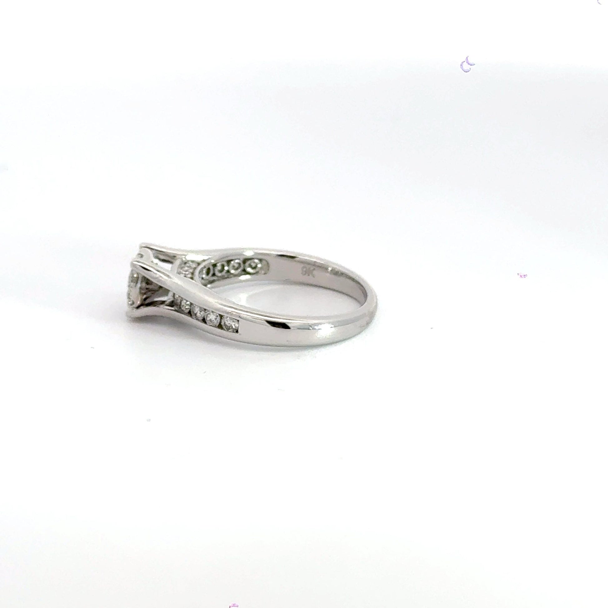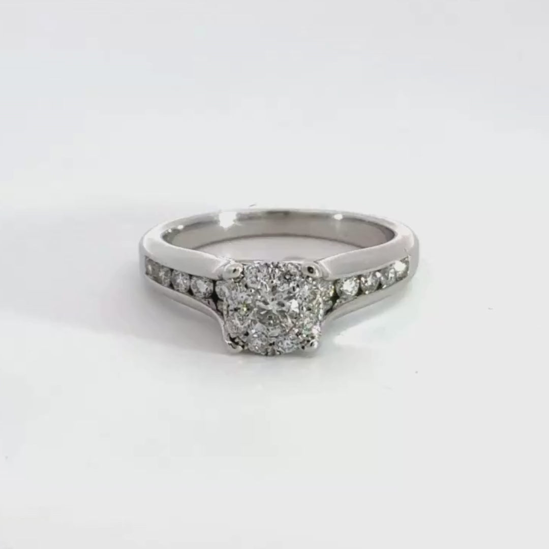 Introducing our exquisite 9ct white gold ring, featuring a stunning raised brilliant round cut centre diamond. This captivating design is complemented by a cluster of brilliant round cut diamonds surrounding the centre, along with additional diamonds set underneath the cluster. The diamond channel set shoulders add a touch of elegance, bringing the total diamond weight to 0.60ct. Perfect for special occasions or as a beautiful statement piece, this ring combines sophistication and sparkle. Discover the beauty of this timeless design today. Size I1/2
