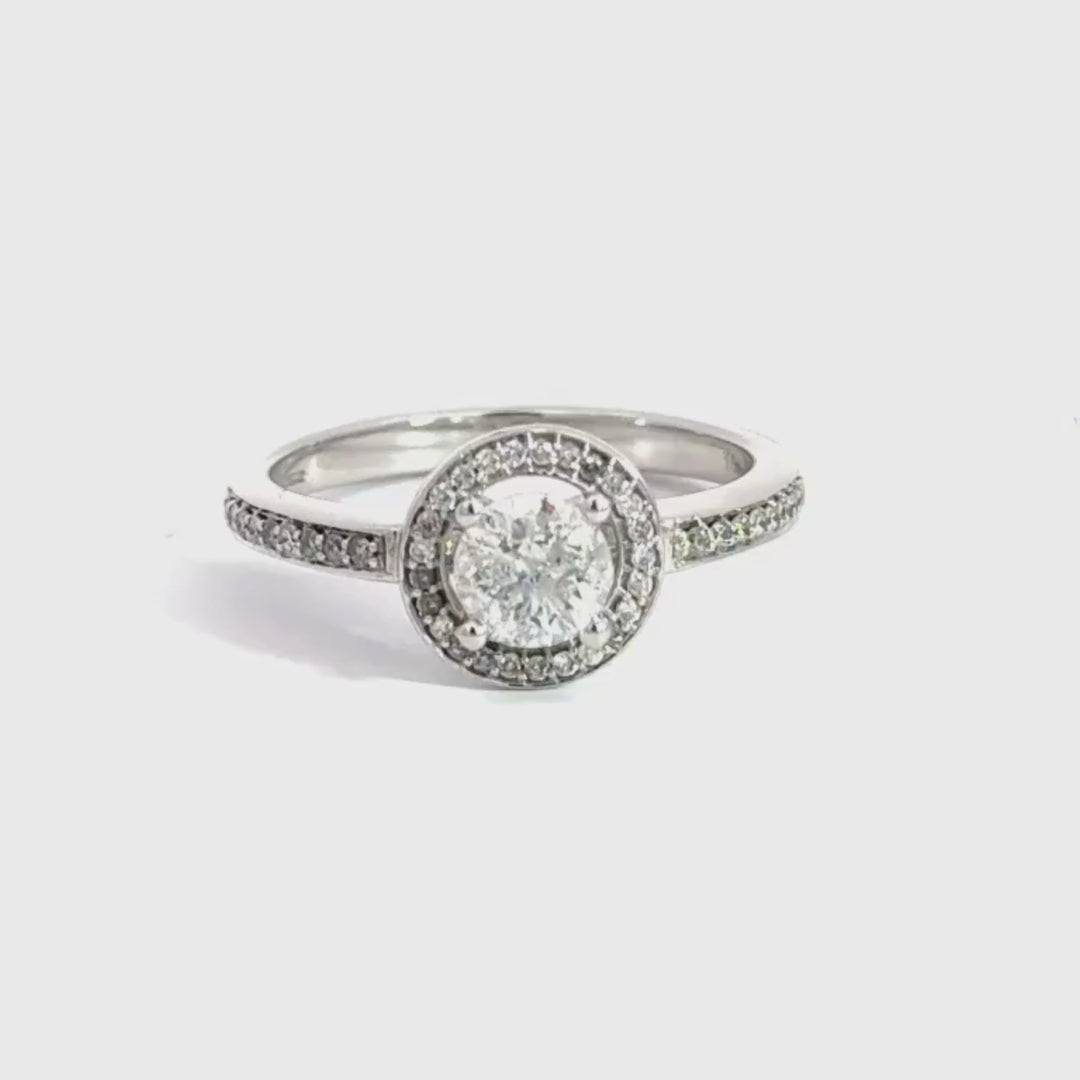 9ct white Gold Round Halo ring with a brilliant round cut centre diamond set in 4 claws with a halo of smaller brilliant round cut diamonds and diamond shoulders totalling 0,79ct size M