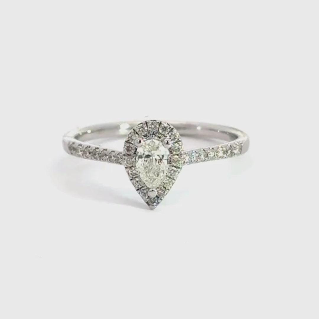 This stunning 9ct white gold teardrop ring features a brilliant cut teardrop centre diamond with a halo of brilliant round cut smaller diamonds and diamond claw set shoulders the sparkle of this ring is outstanding it certainly won’t be missed. The diamond totals 0.50ct G Colour SI1 Clarity Size S