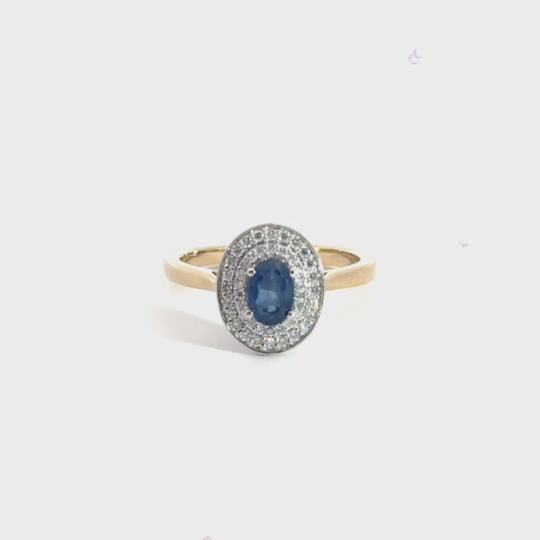 9CT Yellow Gold Diamond Sapphire Oval Halo Ring