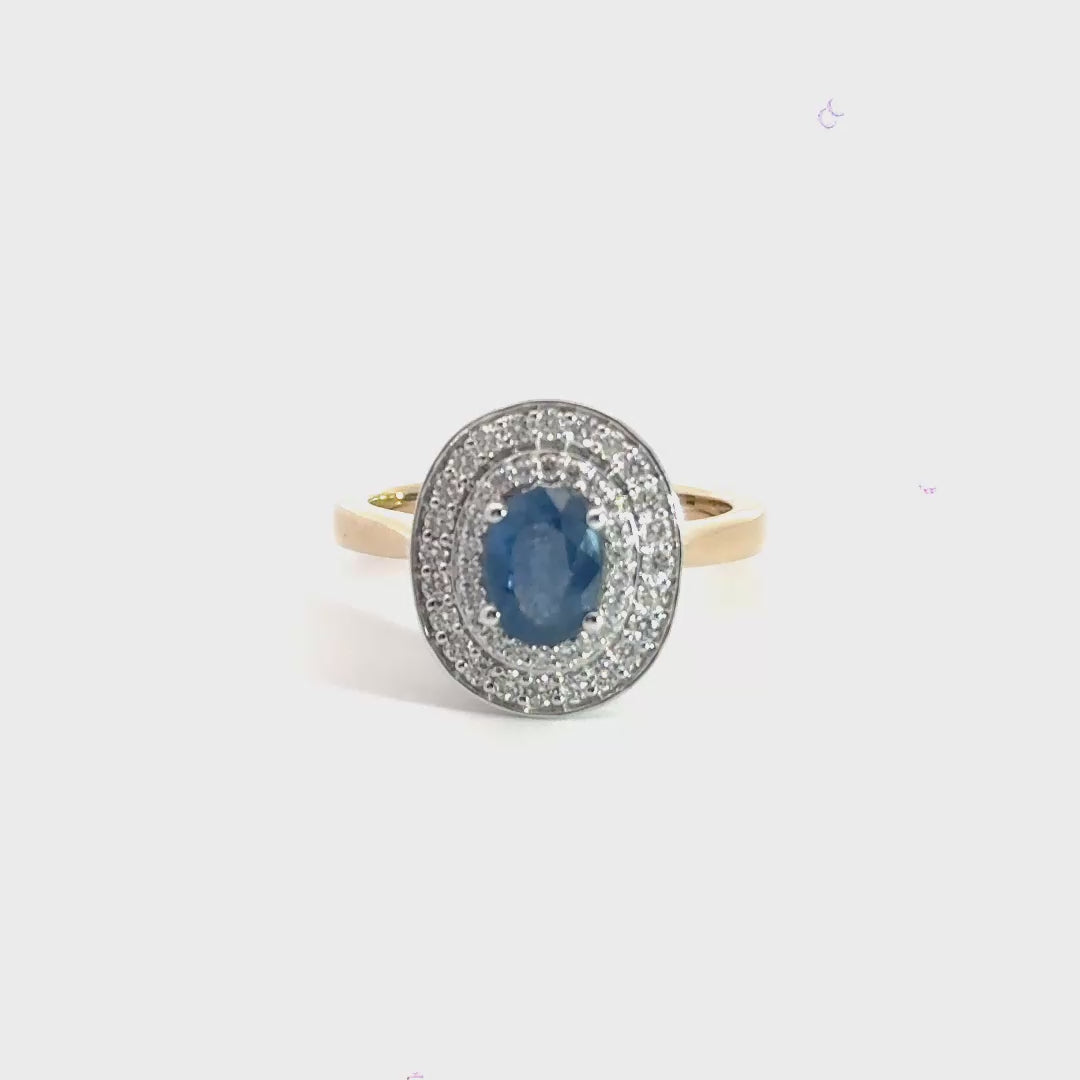 9CT Yellow Gold / White Gold Oval Sapphire Diamond Ring Double Halo