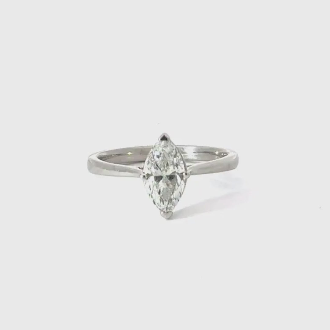 Discover the Platinum Marquise Diamond Solitaire Ring, featuring a 1.00CT G/SI1 marquise-cut diamond in an elegant four-claw setting. A timeless choice for any occasion.