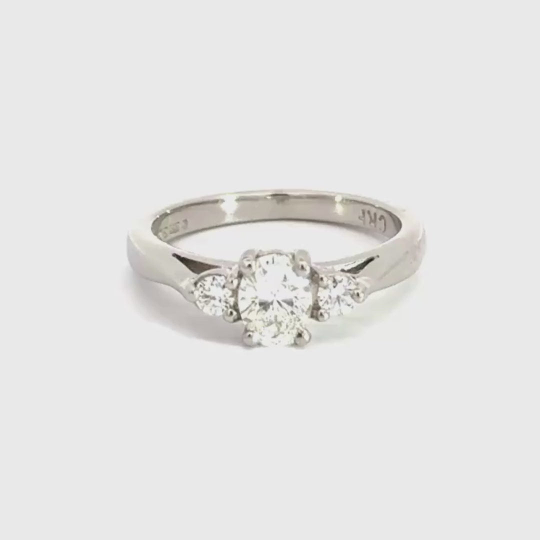 This Attractive Platinum Trilogy ring consists of stunning brilliant round cut centre diamond with a smaller brilliant round cut diamond on either side that catch the light perfect and give it an luminous sparkle, white sitting on a smooth platinum band the centre diamond is 0.36ct ring total is 0.50ct G Colour VS2 Clarity. size G