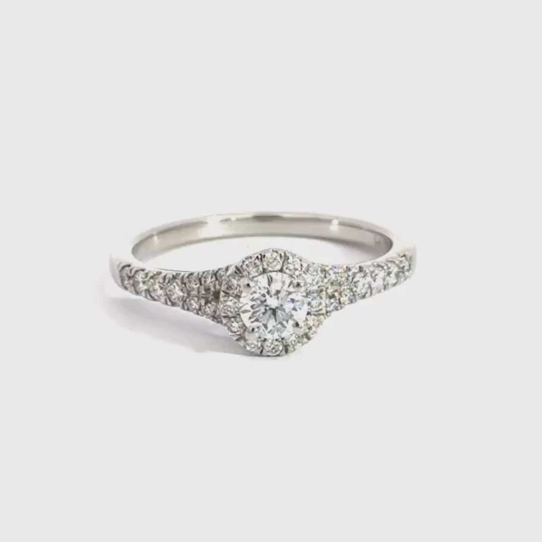 This platinum Halo design ring features a brilliant round cut centre diamond surrounded by a halo of smaller brilliant round cut claw set diamonds on a platinum band with diamond encrusted split shoulders, wed fit made to pair perfectly with any band 0,60ct diamond total G Colour SI Clarity Size M1/2