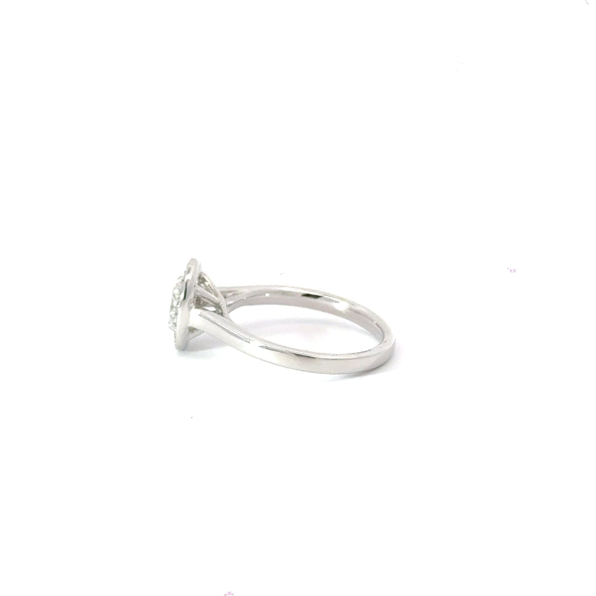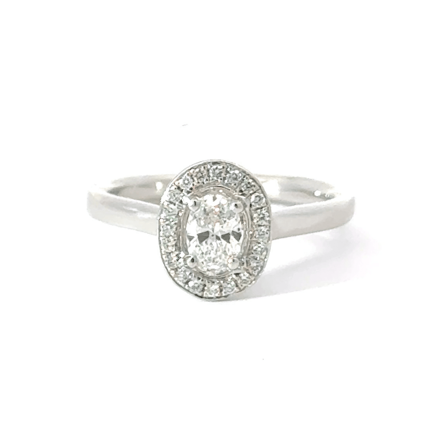 Elevate your elegance with this exquisite platinum diamond oval halo ring. At its centre lies a brilliant oval cut diamond, beautifully surrounded by a halo of sparkling brilliant cut diamonds. The sleek platinum band enhances the ring’s sophisticated design, creating a timeless look.