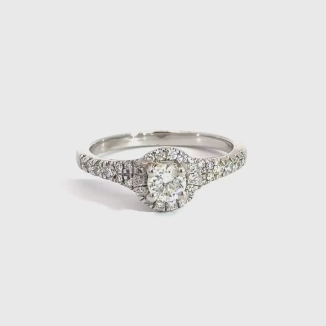 A beautiful Platinum Halo Engagement ring featuring a brilliant round cut centre stone with a halo of smaller brilliant round cut diamonds and diamond encrusted split shoulders totalling 0.75ct wed fit design to ensure a perfect fit with any band the diamonds are G in Colour SI1 Clarity Size M