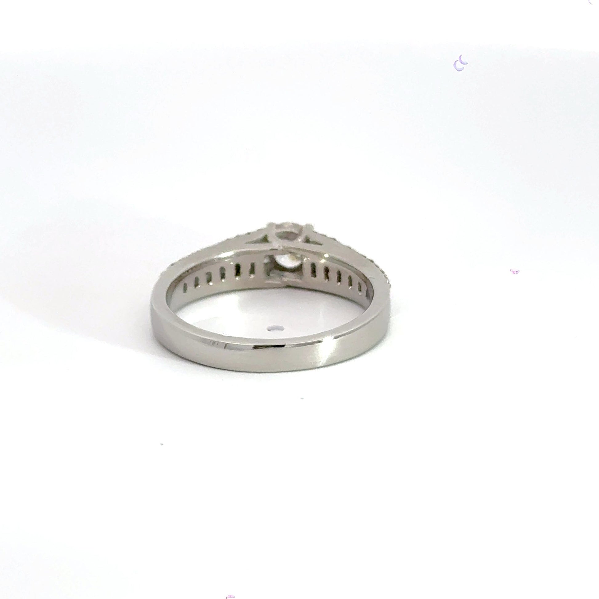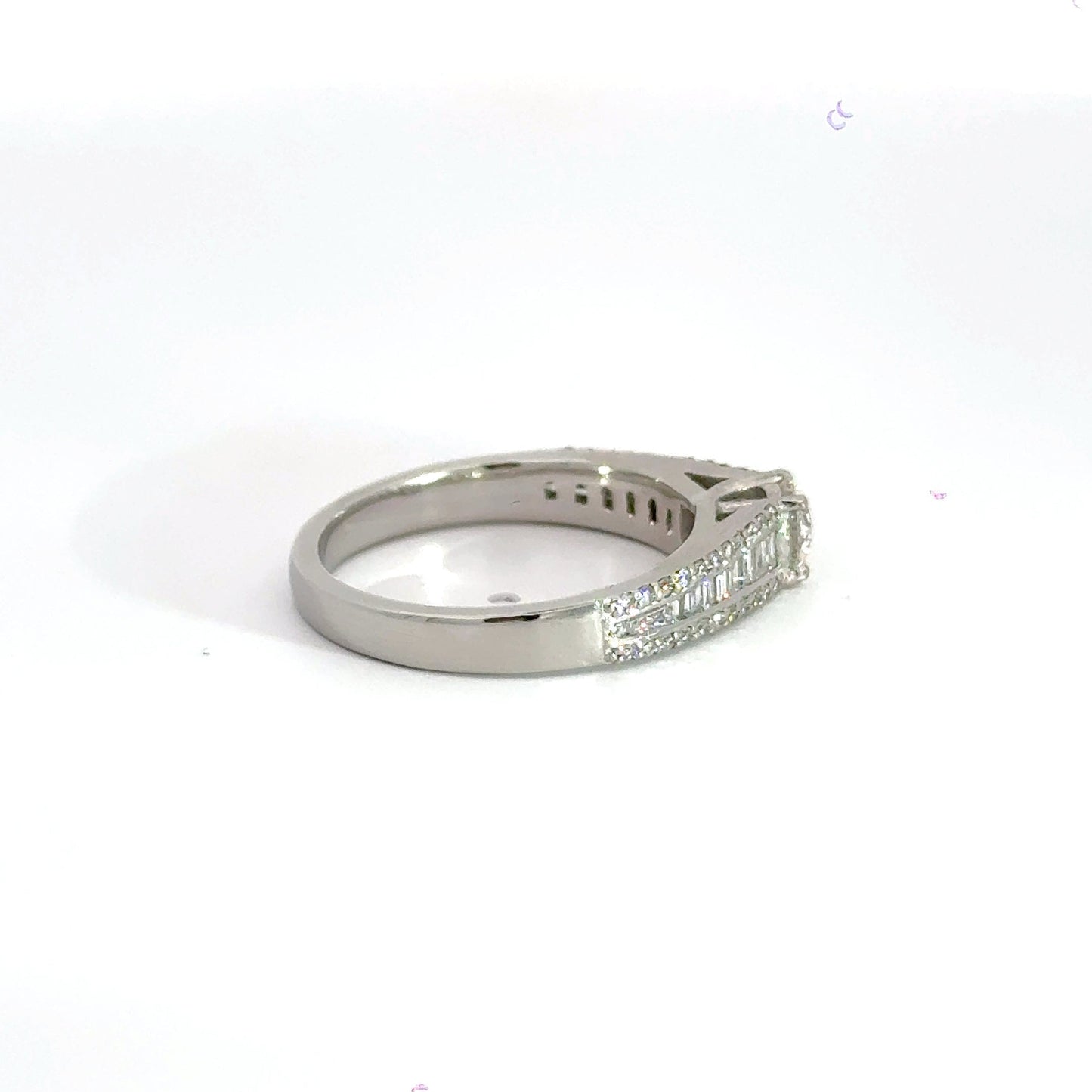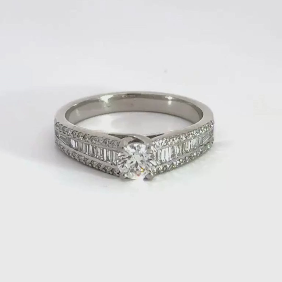 Welcome to our exquisite collection of platinum diamond solitaire rings. Featuring a stunning 0.55ct brilliant round cut centre diamond, this ring is enhanced by elegant baguette and round cut diamond shoulders, totalling 1.00ct. With E colour and VS1 clarity, this piece radiates timeless beauty and sophistication, perfect for marking life’s special moments. Explore our selection and find the perfect symbol of your love. Size O