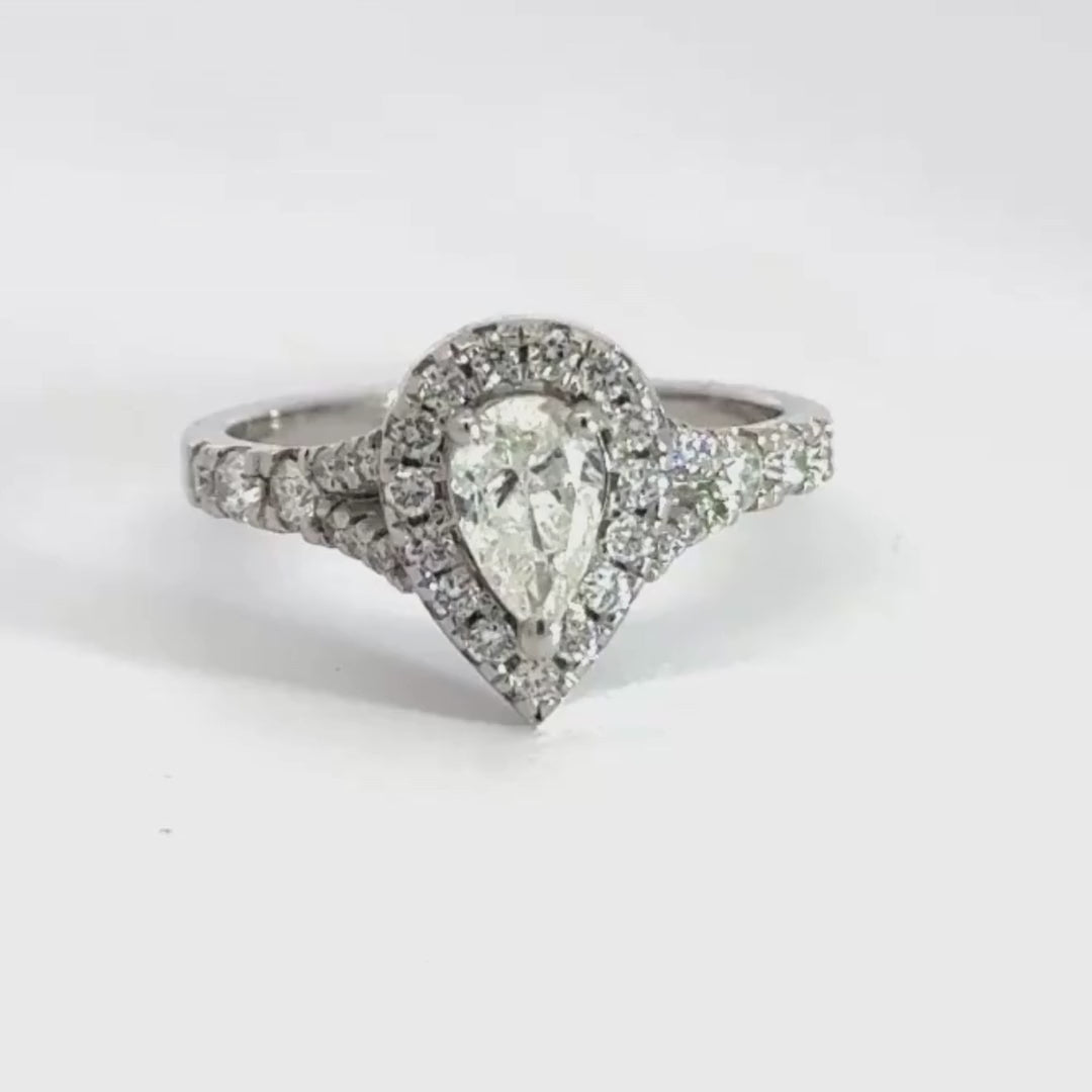 Experience timeless elegance with this platinum diamond teardrop ring. At its heart is a brilliant cut centre diamond, beautifully accentuated by a halo of sparkling round cut diamonds. The exquisite split shoulders add a touch of sophistication, creating a seamless flow of light and brilliance.With a total diamond weight of 1.00ct featuring G colour and SI1 clarity, this ring offers exceptional sparkle and clarity. Ideal for engagements or special occasions, it’s a stunning symbol of love and commitment. Size M