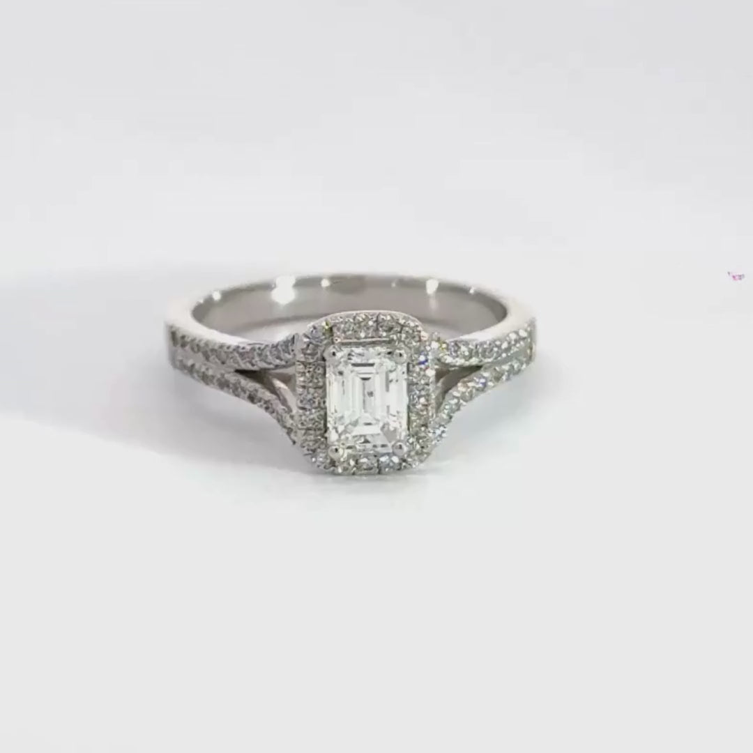 Discover elegance with our platinum rectangle halo ring, featuring a striking emerald cut centre diamond surrounded by a dazzling halo of brilliant round cut diamonds. With a total diamond weight of 0.85ct and G colour, SI1 clarity, this ring showcases a unique blend of modern sophistication and timeless charm. Perfect for celebrating love and special occasions, this piece is sure to impress. Explore our collection and find your dream ring today. Size L