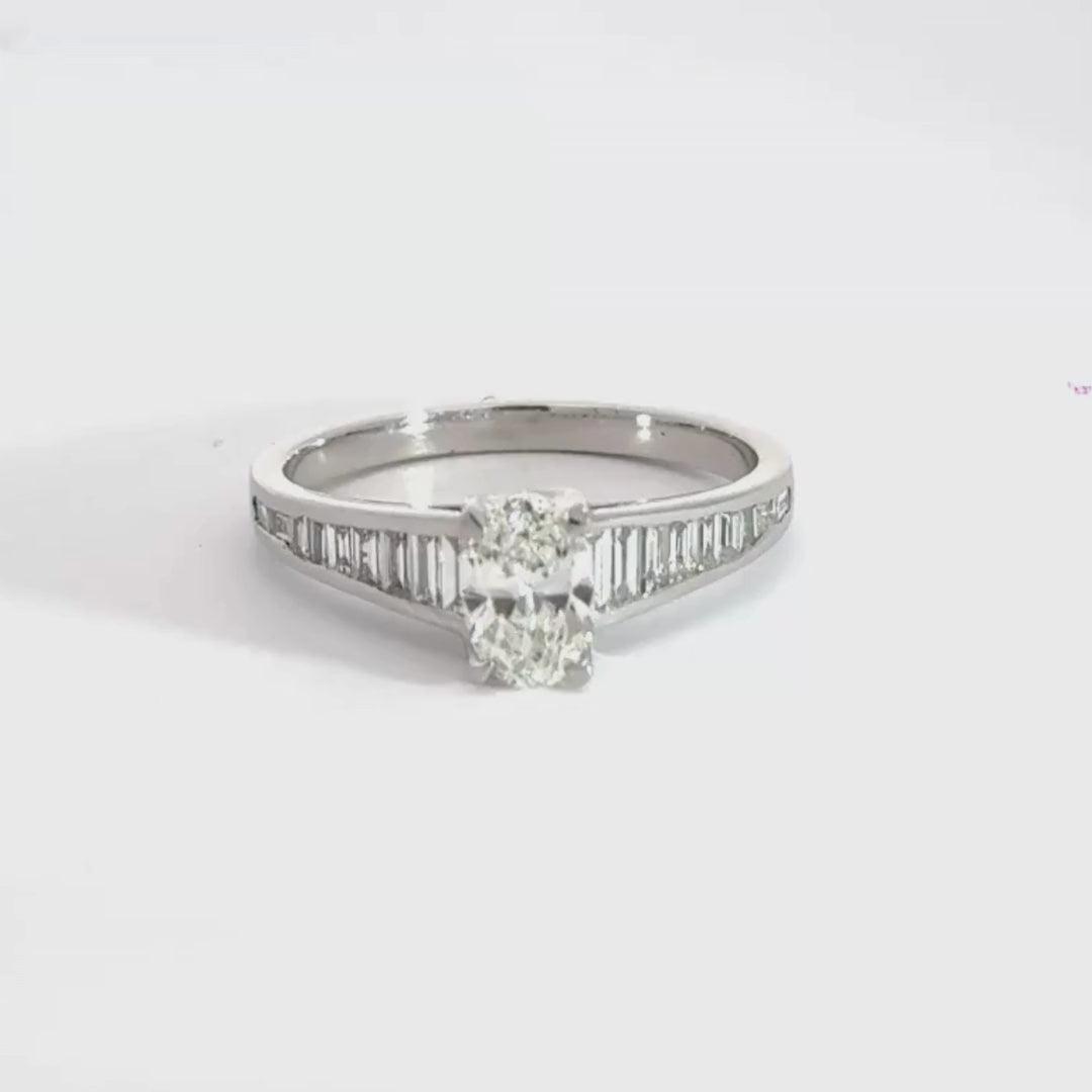 This elegant platinum oval solitaire diamond ring features a captivating 0.50ct oval diamond at its centre renowned for its exceptional E color and VS clarity. The ring is beautifully enhanced by baguette diamond shoulders of 0.50ct which add a sophisticated touch and amplify the overall brilliance. The timeless design combines classic elegance with modern flair, making it a perfect choice for engagements or special milestones. This exquisite piece is sure to be cherished for a lifetime. Size L1/2