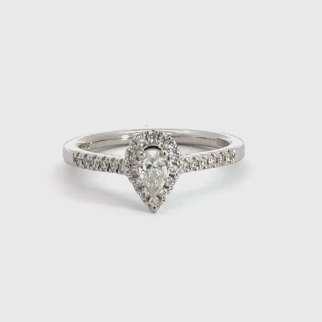 An Elegant Hand crafted Platinum teardrop Engagement ring features a brilliant cut teardrop centre diamond surrounded by a Halo of smaller brilliant round cut diamonds with diamond claw set shoulders wed fit design for the perfect pairing 0.60ct diamond total E Colour SI Clarity Size K