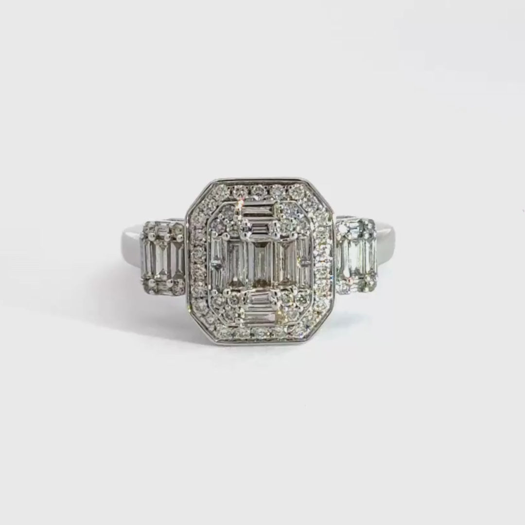 This dazzling 14 ct white gold engagement ring comes with a trilogy of 0.75 ct diamonds. It also features a round cut diamond halo. This ring is g coloured and si1 clarity. This stunning ring was handcrafted by our jeweller in store. Available in size N 1/2 in store but please enquire about resizing.CODE: ACES-386